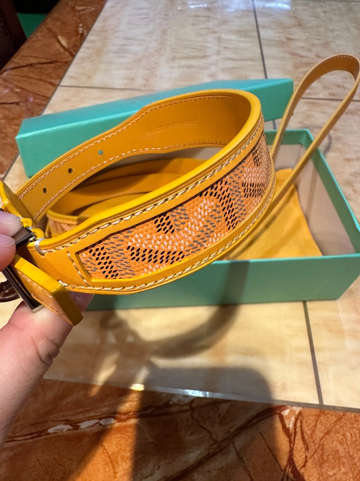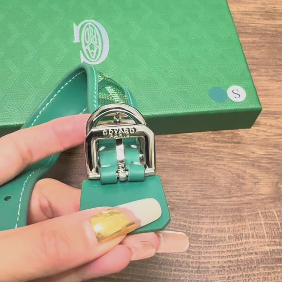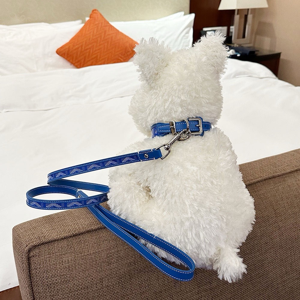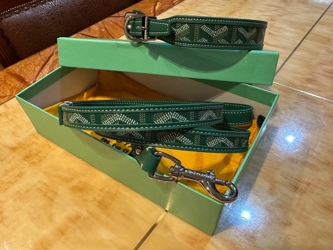 Introducing a premium collar and leash set designed for pet owners who appreciate heritage style and uncompromising quality. This set features a distinctive, recognizable pattern, offering a sophisticated aesthetic without the premium price tag.